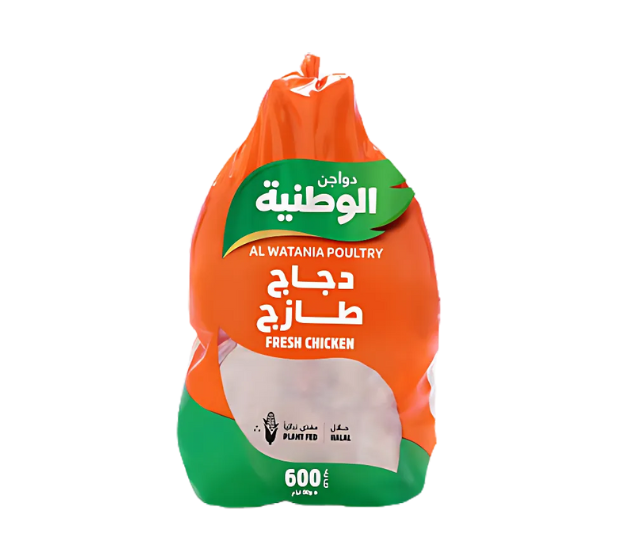 دجاج طازج فاخر وزن ٦٠٠ جرام، مغذى طبيعيا خلال جميع مراحل تربيته في مزارع دواجن الوطنية حتى الذبح. مذبوح وفقا للشريعة الإسلامية ، عالي القيمة الغذائية ومبرد بالهواء مما يحافظ على طعمه الرائع  وقيمته الغذائية. يتم تنظيفه وتعبئته آليا وفق أحدث المعايير العالمية